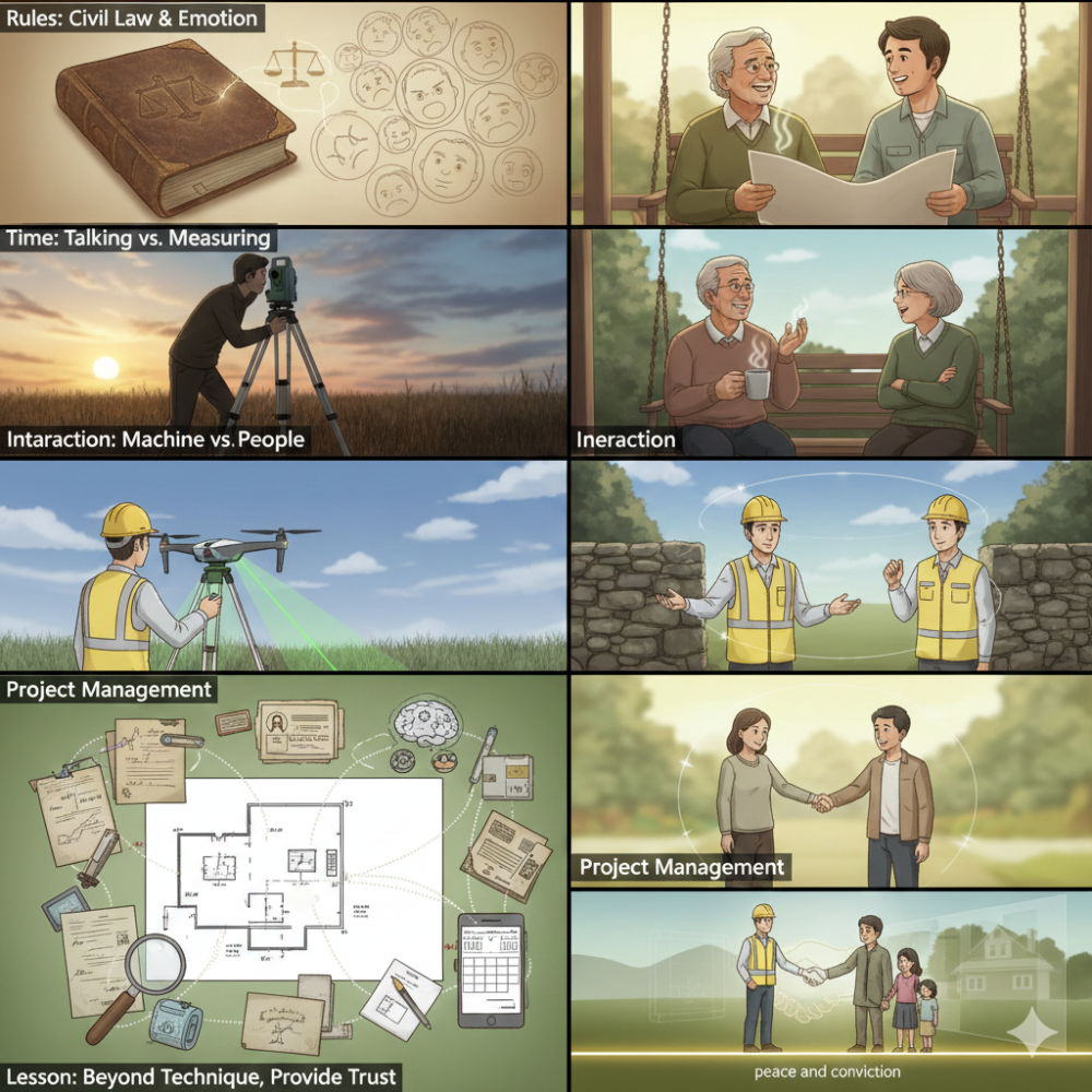 測量士の業務は、多くの場合、国や自治体が定める「作業規程」や「仕様書」に沿って進められます。しかし、土地家屋調査士が向き合うのは、必ずしも論理的ではない「個人の感情」や「先祖代々のこだわり」です。図面上の正しさだけでは、境界は決まりません。法律(民法・不動産登記法)を背景に持ちつつ、地権者の心に寄り添う力が不可欠となります。